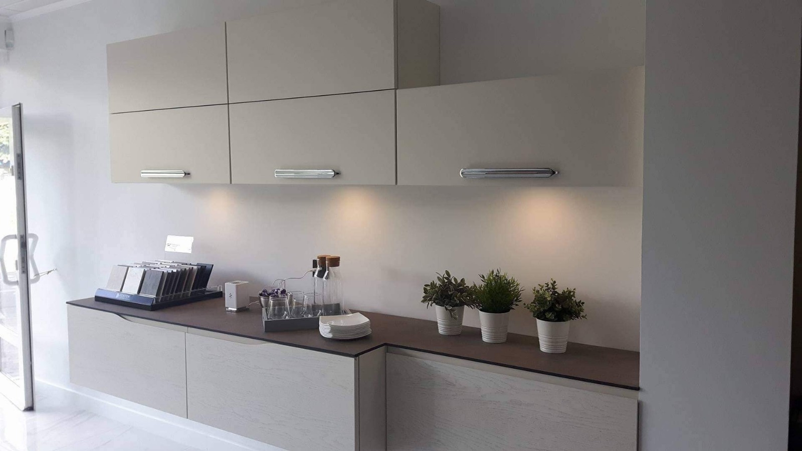 Górne fronty lakier mat, dolne fronty fornir bezuchwytowy, podnośniki Aventos HK, HL,HF, szuflada wewnętrzna. Blat kompakt. Długość 2,70. Meble pełnowartościowe nie uszkodzone.